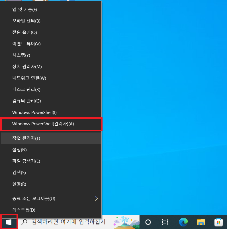 ▲ 작업표시줄 좌측에 있는 시작 버튼을 [마우스 우 클릭 - Windows PowerShell(관리자)]를 클릭합니다.