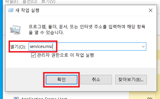 ▲ 새 작업 실행창이 나타나면, [services.msc]를 입력 후 [확인]을 클릭합니다.