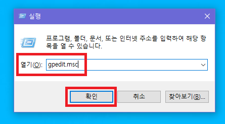 ▲ [윈도우키 + R] 단축키를 사용하여 실행창을 열어주신 후 [gpedit.msc] 명령어를 입력 후 [확인]을 클릭합니다.