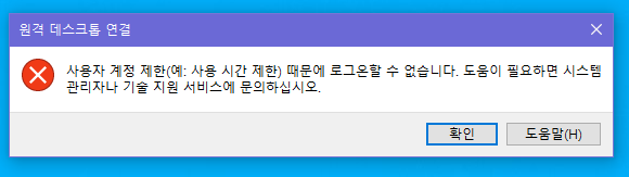 ▲ 위와 같이 원격 데스크톱 연결을 시도할때 [사용자 계정 제한(예: 사용 시간 제한) 때문에 로그온할 수 없습니다.] 오류 메세지와 함께 원격 데스크톱 연결이 안되는 경우가 있습니다.