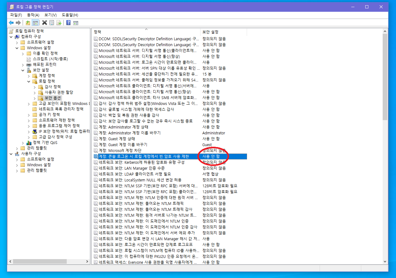 ▲ 계정: 콘솔 로그온 시 로컬 계정에서 빈 암호 사용 제한이 [사용 안 함]으로 설정되면, 윈도우 원격 데스크톱 연결시 "사용자 계정 제한" 오류 해결됩니다.