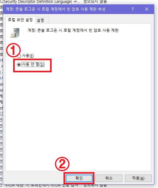 ▲ 계정: 콘솔 로그온 시 로컬 계정에서 빈 암호 사용 제한 속성창이 나타나면, [사용 안 함]에 체크 후 [확인]을 클릭합니다.