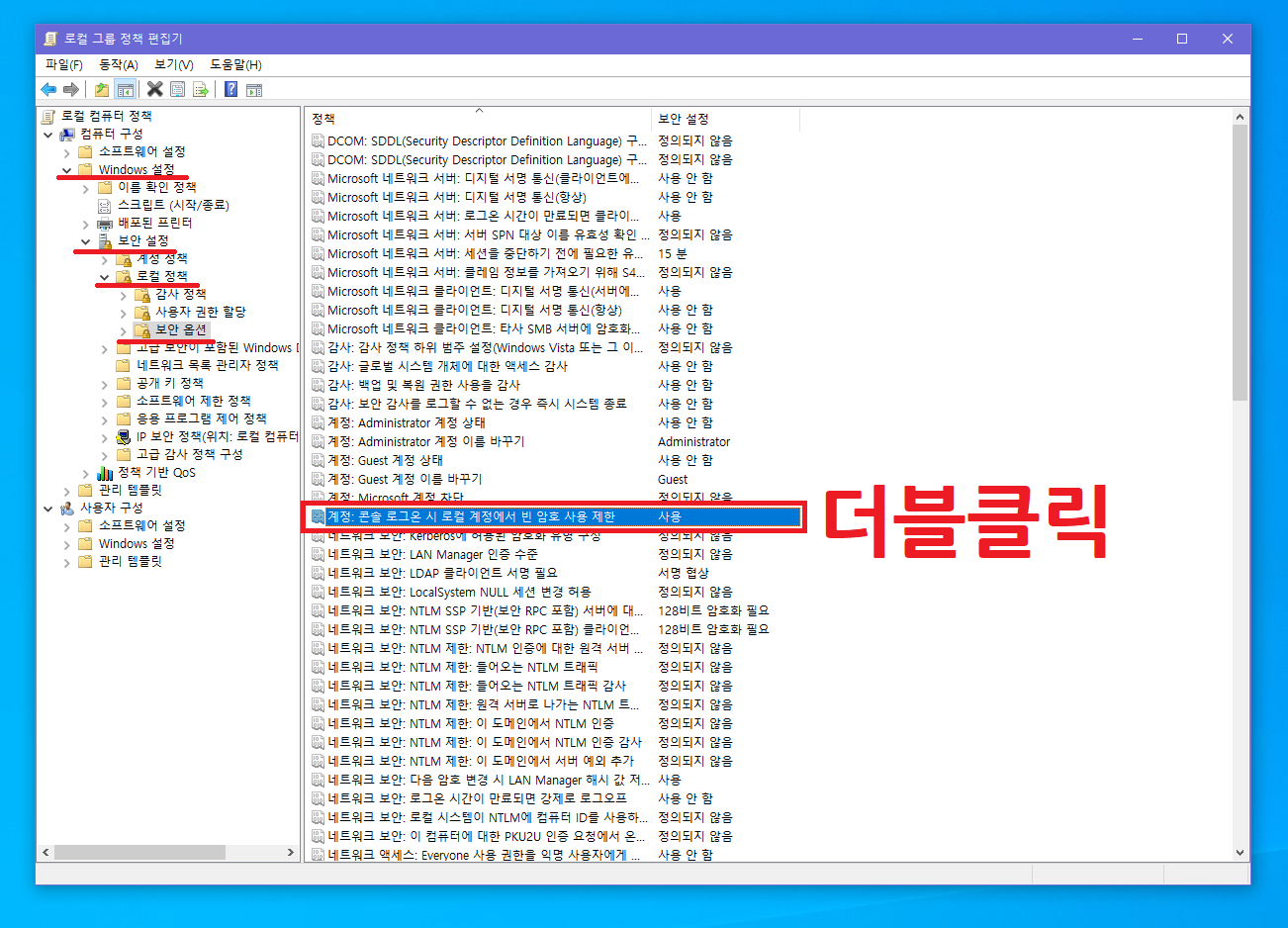 ▲ 로컬 그룹 편집기 창이 열리면, 좌측 메뉴에서 [Windows 설정 - 보안 설정 - 로컬 정책 - 보안 옵션]에 있는 [계정: 콘솔 로그온 시 로컬 계정에서 빈 암호 사용 제한] 항목을 더블클릭 합니다.