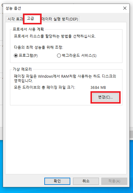 ▲ 그럼 위와 같이 성능 옵션창이 나타나는데, 상단에 있는 [고급]탭을 클릭 후 가상 메모리 부분에 있는 [변경]을 클릭합니다.