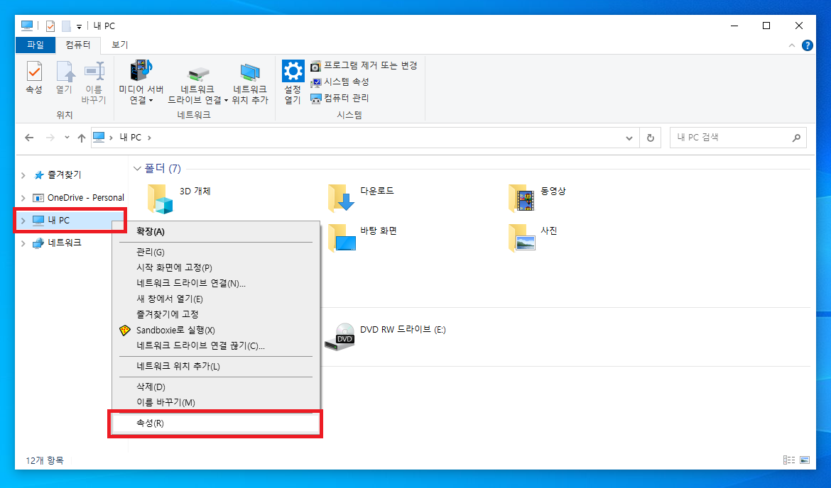 ▲ [윈도우키 + E] 단축키를 사용하여 파일 탐색기창을 열어주신 후 좌측에 있는 [내PC - 마우스 우 클릭 - 속성]을 클릭합니다.