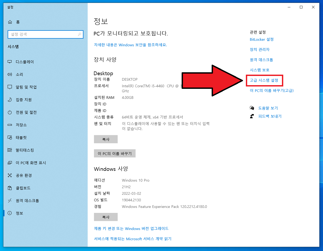 ▲ 시스템창이 열리면, 좌측 혹은 하단에 있는 [고급 시스템 설정]을 클릭합니다.