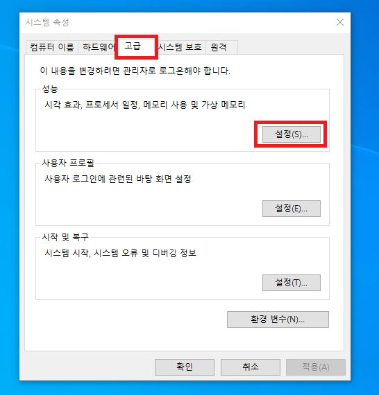 ▲ 시스템 속성창이 열리면, 성능 부분에 있는 [설정]을 클릭합니다.
