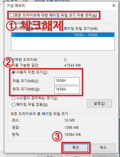 ▲ 가상 메모리 설정창이 열리면, [모든 드라이브에 대한 페이징 파일 크기 자동 관리] 부분의 체크해제 후 [사용자 지정 크기]부분에 체크 후 기존에 설정되어있는 가상 메모리 크기보다 더 큰 용량을 설정해주신 후 [확인]을 클릭합니다.