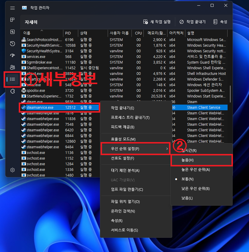 ▲ 작업 관리자창이 열리면, [세부 정보]탭을 클릭 후 [Steamservice.exe] 항목을 선택 후 [마우스 우 클릭 - 우선 순위 설정 - 높음]을 클릭합니다.