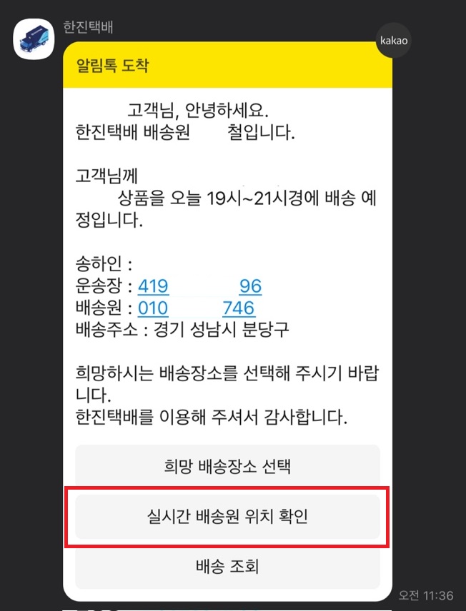 ▲ 모바일의 경우 자신의 정보로 되어있는 카카오톡으로 알림톡이 도착하며, 알림톡 하단에 "실시간 배송원 위치 확인"을 눌러 자신의 택배의 실시간 위치를 확인하실 수 있습니다.