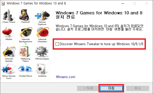 ▲ 설치완료창이 나타나면, 제휴 광고 프로그램인 "Discover Winaero Tweaker to tune up Windows 10/8.1/8" 체크 해제 후 "마침"을 클릭합니다.