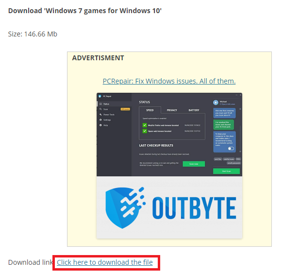 ▲ 아래에 있는 링크를 통하여 윈도우7 기본 게임 다운로드 사이트로 이동해주신 다음 "Click here to download the flie"을 클릭하여 윈도우7 기본게임 설치 프로그램을 다운로드 합니다.